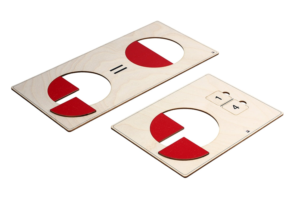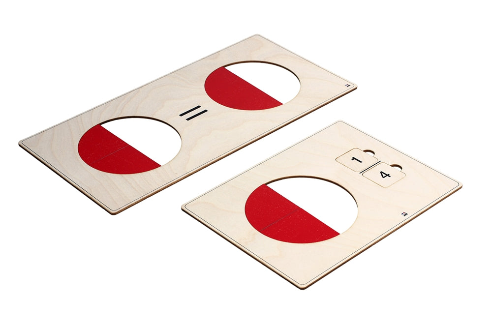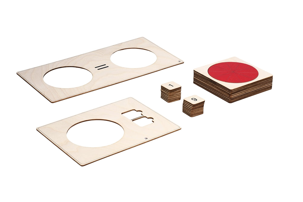 This product comes with 2 large working frames, 10 sets of fractions with countering frames, and numbered tiles. Children can work on practicing writing the symbolic representation of fractions. They can also explore fraction equivalencies using the comparative frame with the equals sign between two circular holes.