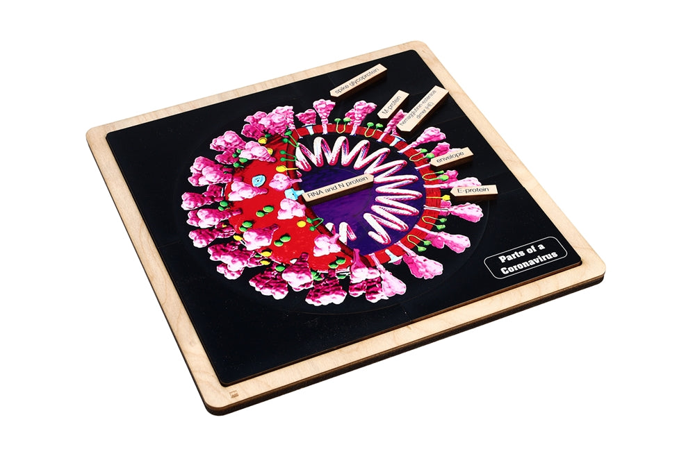 It also includes a wooden Parts of a Coronavirus puzzle. The puzzle contains wooden labels. A slight ridge on all four sides enables easy lifting of the pieces.