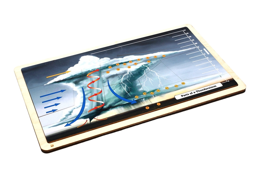 It also includes a wooden Parts of a Thunderstorm puzzle along with laminated and cut cards. The puzzle contains wooden labels. A slight ridge on all four sides enables easy lifting of the pieces.