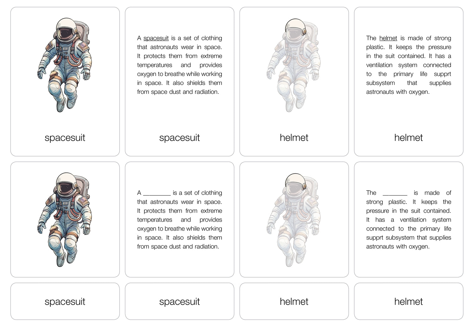 | The parts of an astronaut spacesuit shown are: | This set of three-part nomenclature cards includes the following: | |