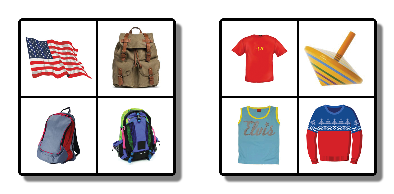This pre-reading activity explores categorization and critical thinking through visual discrimination. Each card features a grid of four images, three that belong to the same category and one that does not.